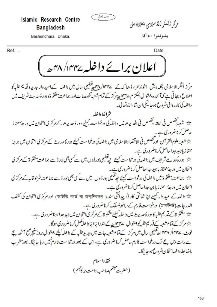 উল্লেখ্য যে ২৯ শা’বান বুধবার সকাল থেকে ভর্তি শুরু হবে।