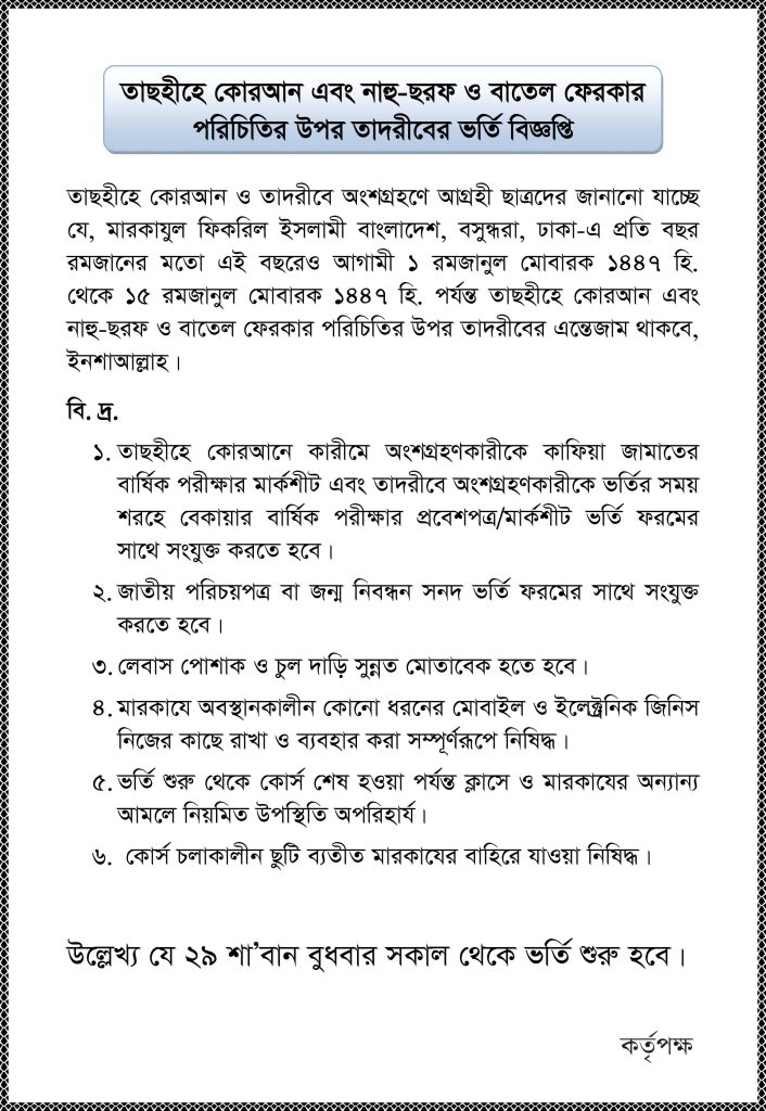তাছহীহে কোরআন ও তাদরীবে অংশগ্রহণে আগ্রহী ছাত্রদের জানানো যাচ্ছে যে, মারকাযুল ফিকরিল ইসলামী বাংলাদেশ, বসুন্ধরা, ঢাকা-এ প্রতি বছর রমজানের মতো এই বছরেও আগামী ১ রমজানুল মোবারক ১৪৪৭ হি. থেকে ১৫ রমজানুল মোবারক ১৪৪৭ হি. পর্যন্ত তাছহীহে কোরআন এবং নাহু-ছরফ ও বাতেল ফেরকার পরিচিতির উপর তাদরীবের এন্তেজাম থাকবে, ইনশাআল্লাহ।